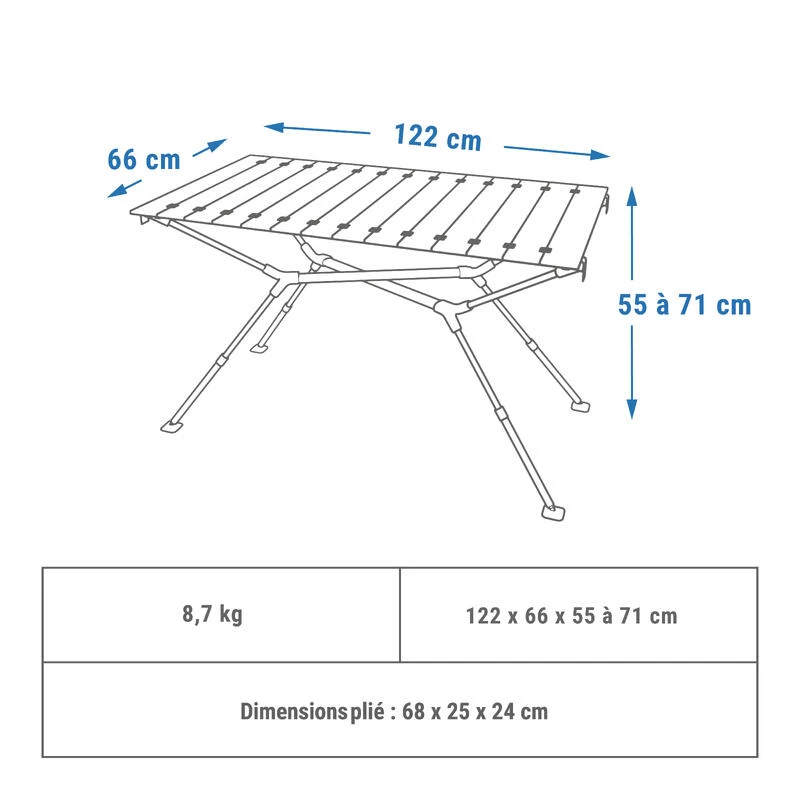 Nos tables de camping ont été conçues pour un usage outdoor ponctuel lors de vos sorties camping, dans votre jardin ou en pleine nature. Une exposition continue de plusieurs semaines aux UV ou à l’humidité peut les endommager. Ces produits n’entrent pas dans la catégorie « mobilier de jardin » et ne sont pas conçus pour rester en extérieur de façon permanente. Pour garantir une durée de vie optimale à votre table, il est important de la ranger lorsqu’elle n’est pas utilisée.