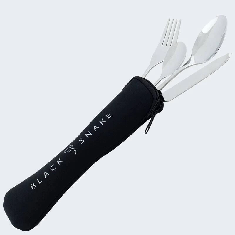· couverts: fourchette, couteau, cuillère et cuillère à café incl. sac