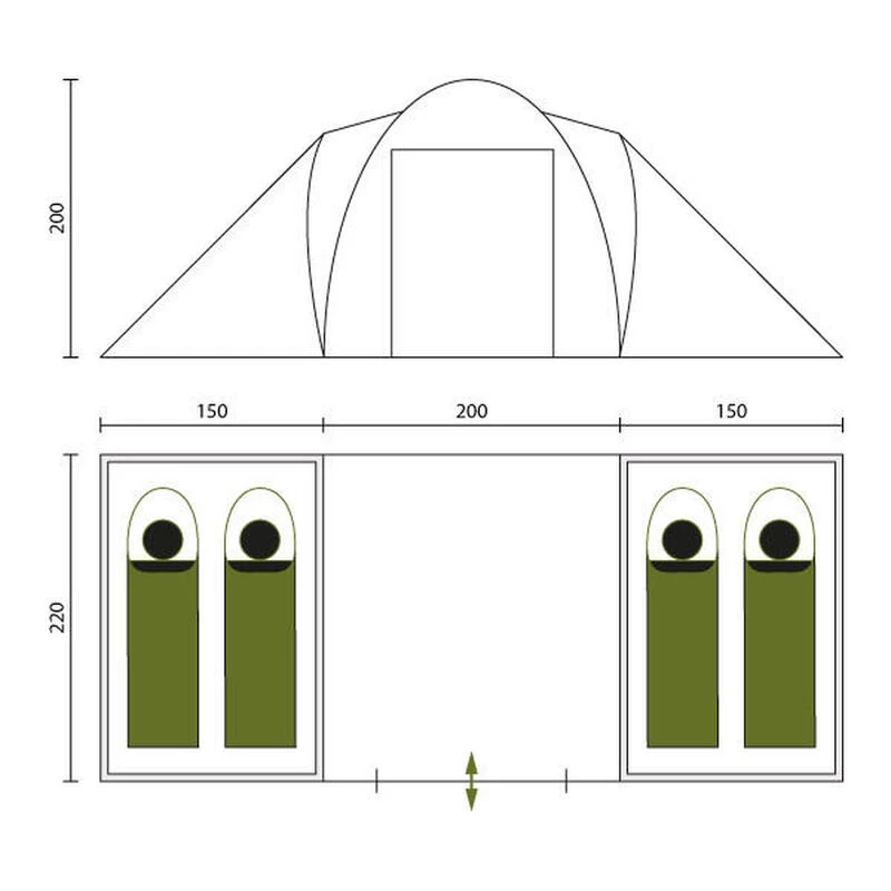 Dimensions: 500 x 220 x 200 cm – Tapis de sol cousu – Cabines sombres – Marquuise aux deux entrées (piquets de relevé livrés) – Crochet pour lampe